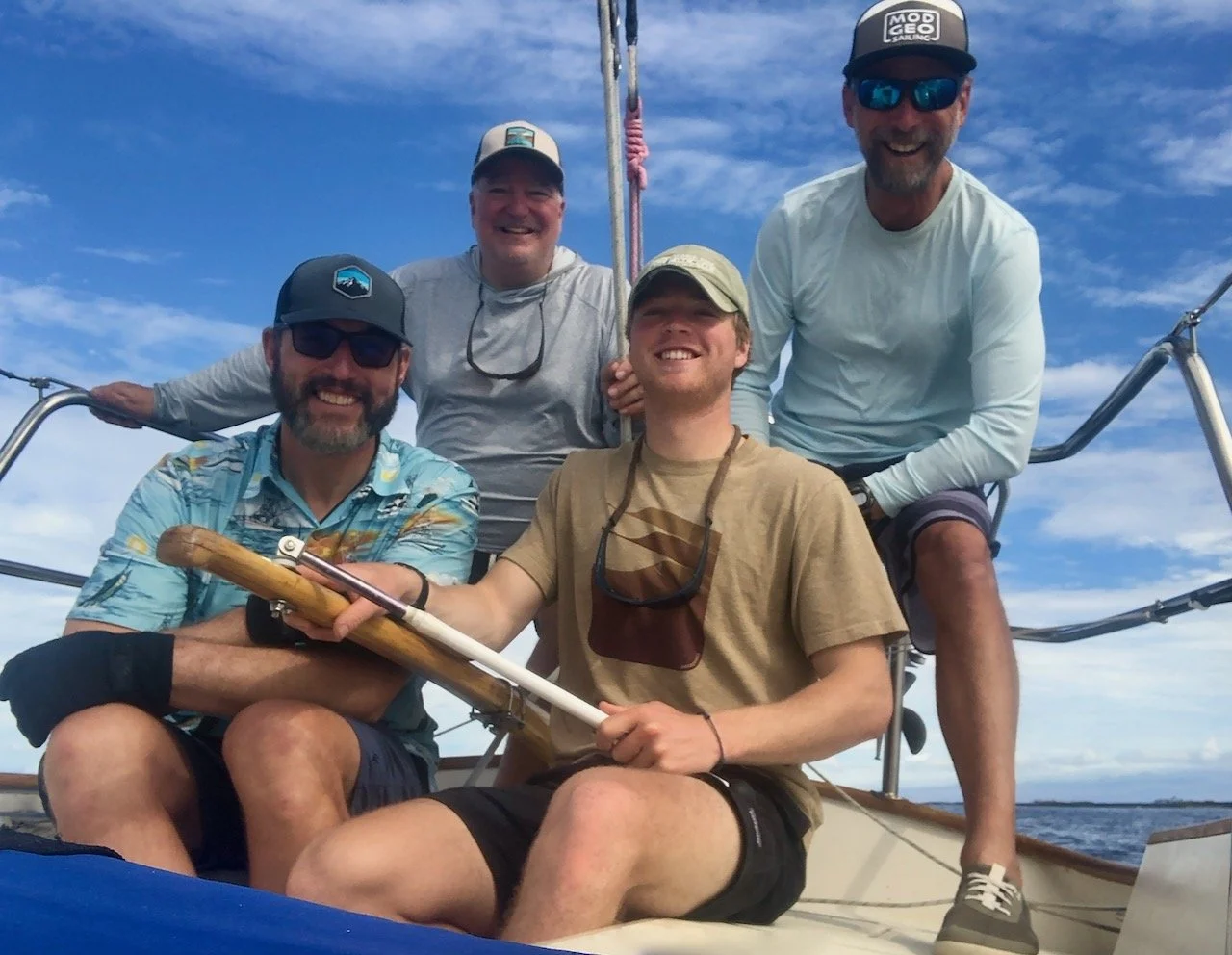Alenuihaha Expedition — Dec. 2023 … TEAM PHOTO: Rick, Mike, Grant, and Paul after their 38 hour round-trip crossing between Big Island and Maui, handling a storm trysail in 40-45 knot winds and 20’ breaking seas for 18 hours during their return-crossing aboard MOD GEO’s SV Solstice.
